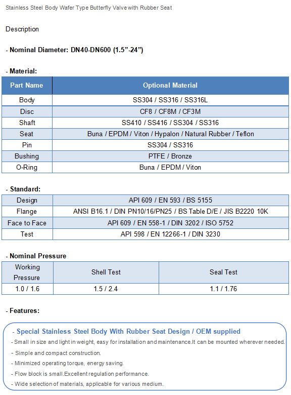 SS Wafer Type Butterfly Valve with Rubber Seat